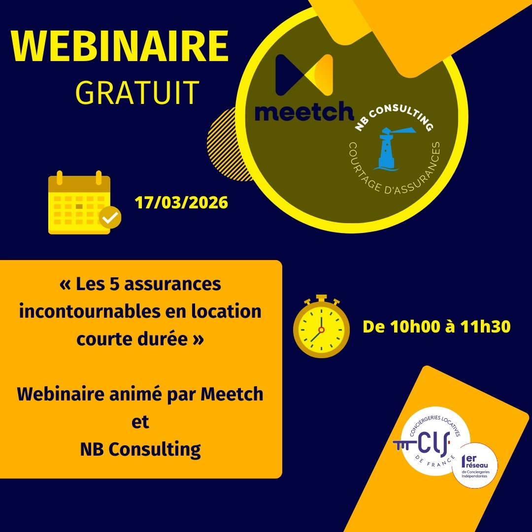 Webinaire gratuit animé par MEETCH et NB CONSULTING. 1h30 pour faire le point sur les assurances en location courte durée !